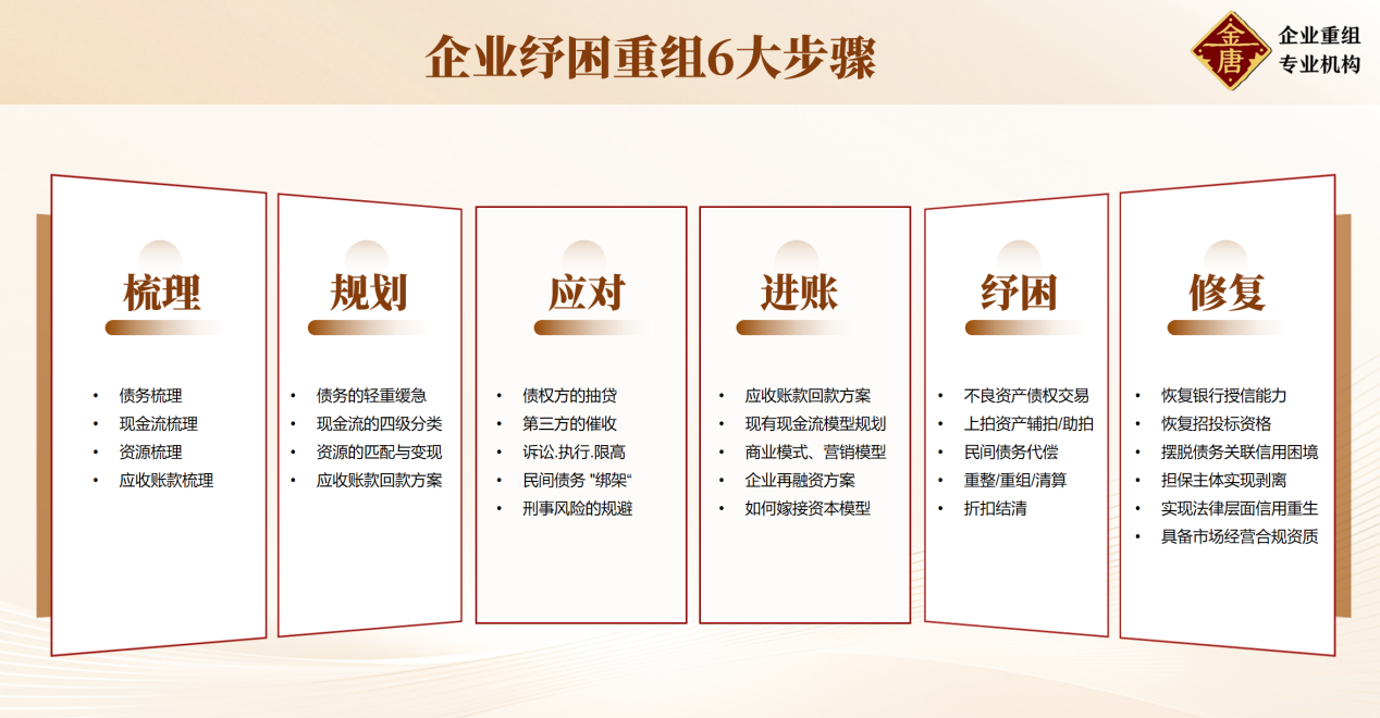 在此基础上,金唐形成“企业债务破局5部曲”与“纾困重组6大步骤”,从全面尽职调查、方案设计、合规落地、资产处置到债务化解、信用修复,每一个环节都实现标准化、精细化运作,确保方案可落地、效果可量化。