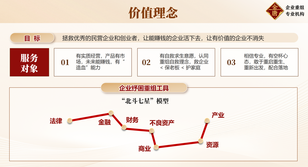 金唐企业纾困重组专业服务精准响应国家号召,紧扣市场痛点,聚焦民营企业债务困境,成为连接政策支持与企业需求的专业纽带,助力优质企业在震荡期实现资源重构与价值重生。