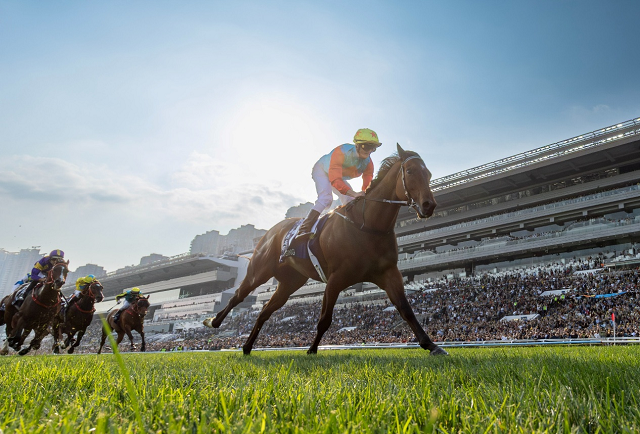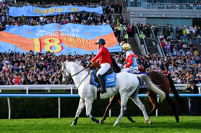 由潘顿策骑的“嘉应高升”取得十八连胜后,向大批支持者挥手致意。