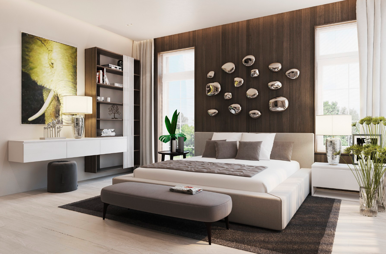 卧室是居住者休息和放松的场所,强调营造安静舒适的氛围。这里配备了嵌入式电视、书桌、衣帽收纳区和卫生间,确保功能多样,既能保证居住的私密性,又能提供便捷的生活体验。主卧的设计更是充满了对居住者的关怀与温暖。质朴的原木与纯净的白色相互交融,营造出温馨的氛围。两面落地窗保证了充足的采光,让室内明亮又舒适。独立的衣帽间和卫浴空间,让人感到安心自在,身心都能得到彻底的放松。