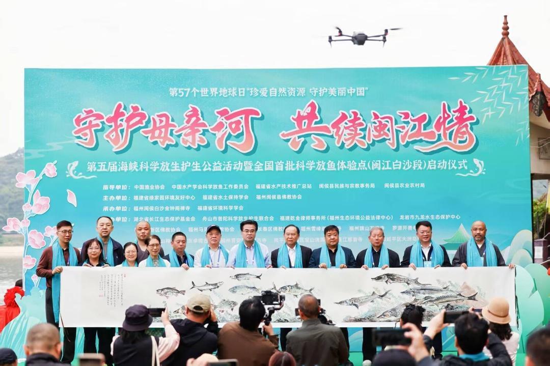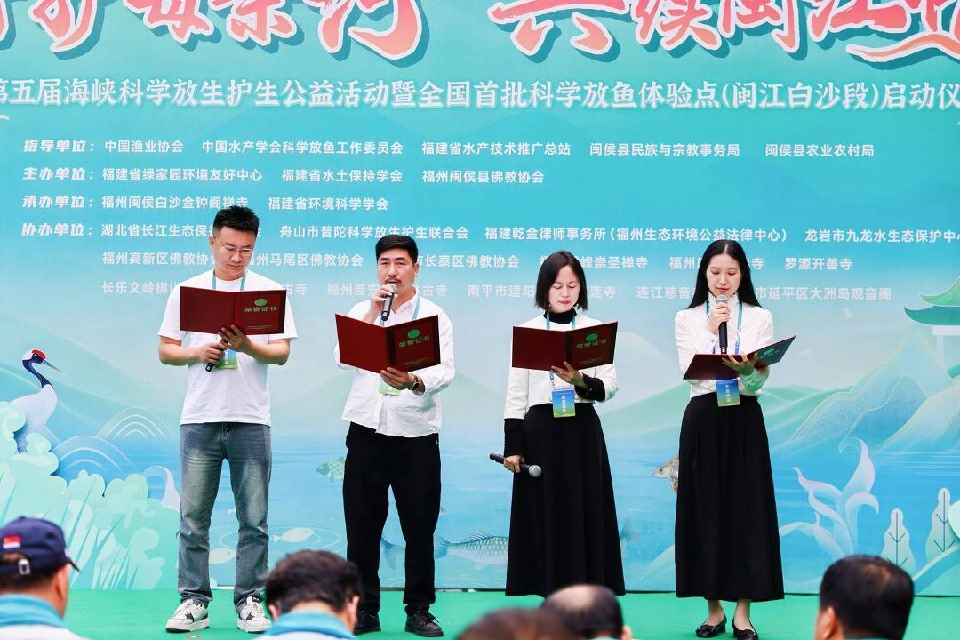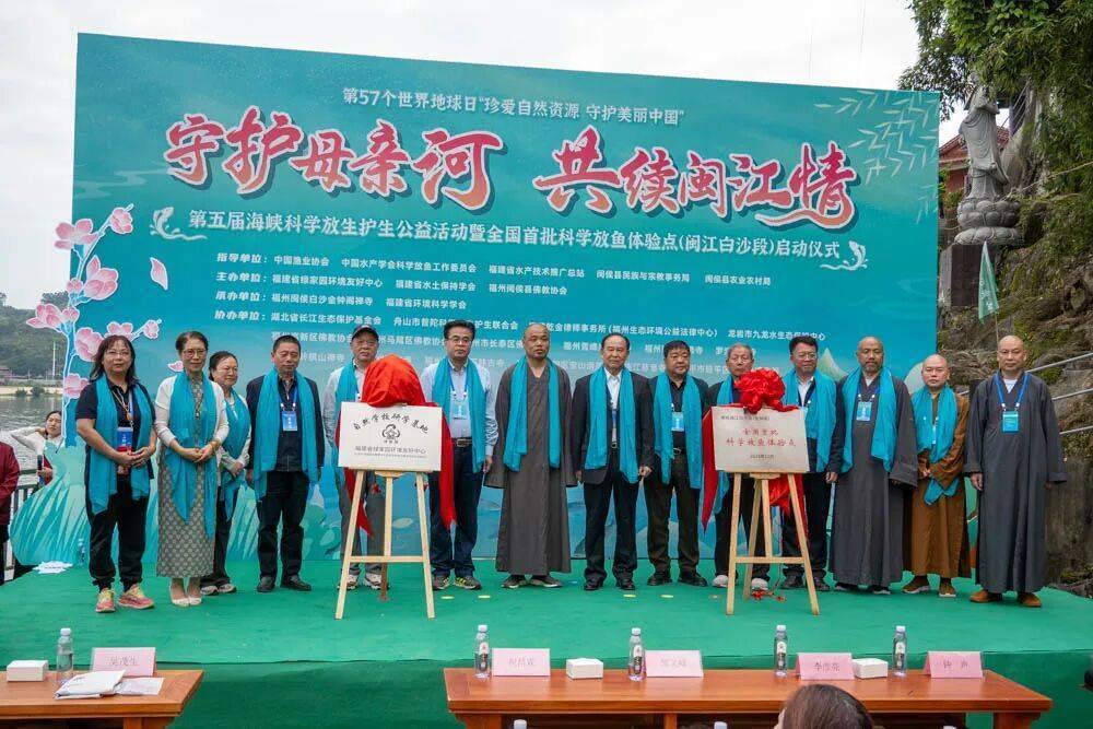 上午9时,政府部门、科研机构、宗教界、公益组织代表及生态环境志愿者齐聚现场。福建省民族与宗教事务厅原二级巡视员钟声、福建省民政厅慈善事业促进处处长邹文峰、中国渔业协会副会长李彦亮、福建省水产技术推广总站站长李水根等嘉宾为长5米的国画《福鱼》点睛,宣布第五届海峡科学放生护生公益活动正式启动。在热烈掌声中,嘉宾们共同宣布“闽侯闽江白沙段全国首批科学放鱼体验点”及“福建省绿家园环境友好中心自然学校研学基地”正式启用,该基地将承担科学示范与公众教育双重使命。